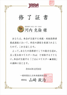 五ツ星お米マイスターProf. に認定されました 2022年12月8日2023年1月18日 この度、五ツ星お米マイスターの最上位となる「五ツ星お米マイスターProf. 」に認定されました。 炊飯と米飯の講師の指導者としての認定も加わります。