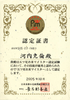 お米の美味しさ、素晴らしさをもっとお伝えするために、お米の博士号と呼ばれる最上位資格「五ツ星お米マイスター」を取得しました。